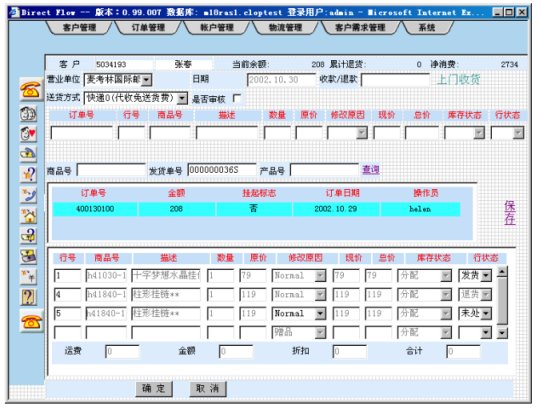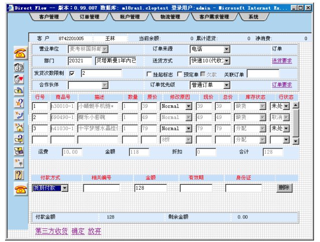 客戶(hù)根據(jù)麥考林提供的產(chǎn)品目錄告訴座席代表所需的產(chǎn)品和數(shù)量,并說(shuō)明送貨方式、付款方式等信息,CRM軟件會(huì)自動(dòng)計(jì)算客戶(hù)的消費(fèi)金額,如果是老客戶(hù)或增在進(jìn)行促銷(xiāo)活動(dòng),軟件會(huì)自動(dòng)計(jì)算相應(yīng)的折扣。如果某種產(chǎn)品缺貨,系統(tǒng)將告訴座席代表,并提供最近到貨日期供客戶(hù)參考。購(gòu)買(mǎi)麥考林的許多商品,會(huì)有一些小禮品贈(zèng)送,CRM軟件會(huì)根據(jù)客戶(hù)訂單列出客戶(hù)可以選擇的小禮品供客戶(hù)選擇。訂單輸入完成后進(jìn)行訂單入庫(kù)操作,并根據(jù)訂單的屬性自動(dòng)生成相關(guān)工單派發(fā)有關(guān)部門(mén)。