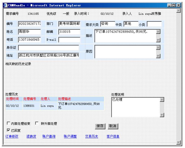 客戶(hù)向麥考林定購(gòu)商品的最常用途徑就是電話訂貨,客戶(hù)撥打麥考林服務(wù)熱線進(jìn)入客服系統(tǒng)。系統(tǒng)會(huì)根據(jù)客戶(hù)的主叫號(hào)碼對(duì)客戶(hù)進(jìn)行識(shí)別,如果識(shí)別成功,座席代表屏幕上會(huì)自動(dòng)彈出客戶(hù)資料和以往訂貨記錄;如果識(shí)別失敗,座席代表可以根據(jù)客戶(hù)通報(bào)的客戶(hù)代碼或姓名等信息查詢(xún)客戶(hù)資料。如果是新客戶(hù),座席代表可以立即為他創(chuàng)建客戶(hù)檔案。