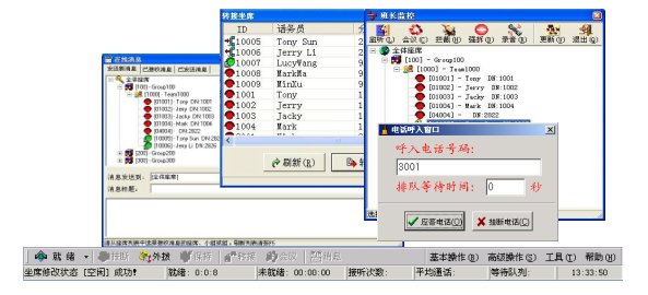 所有線路、座席狀態(tài)、操作時(shí)長(zhǎng)的動(dòng)態(tài)監(jiān)視,動(dòng)態(tài)監(jiān)視呼叫隊(duì)列長(zhǎng)度,并能實(shí)現(xiàn)監(jiān)聽(tīng)、強(qiáng)插、強(qiáng)拆、強(qiáng)制注銷(xiāo)控制功能。