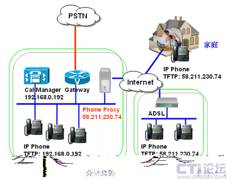 PCS的PhoneProxy是一套軟件,只要在中心CallManager站點安裝一套PhoneProxy,就能實現(xiàn)任何能上網(wǎng)的地方,IP電話都能通過廣域網(wǎng)注冊,不需要任何VPN設備。