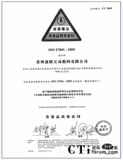 2009年9月28日,蘇州盈聯(lián)公司獲得了由國際權(quán)威認證機構(gòu)香港品質(zhì)保證局頒發(fā)的ISO 27001:2005(信息安全管理體系ISMS)國際認證證書,這標志著蘇州盈聯(lián)公司繼2008年7月通過CMMI3級評估之后又一見證企業(yè)資質(zhì)與能力的重要里程碑。