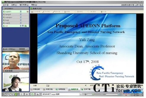 視維視頻會(huì)議系統(tǒng)良好的兼容性,使亞太地區(qū)各成員國的代表雖遠(yuǎn)隔千山萬水,依然可以實(shí)現(xiàn)無限溝通。視維視頻會(huì)議系統(tǒng)所提供的清晰流暢的音視頻使各成員國的代表無需走出國門,無需聚到一起,就可以輕松地網(wǎng)絡(luò)面對面的進(jìn)行交流,既可節(jié)約差旅費(fèi)用,又可避免舟車勞頓之苦,是各國代表有更多精力投入到工作中;視維的共享白板、共享文檔、文件下載等強(qiáng)大的數(shù)據(jù)協(xié)作功能可以使各國代表快速地共享更多的信息、資料,及時(shí)地開展越洋培訓(xùn)。近日網(wǎng)絡(luò)面對面地討論第三屆APEDNN的進(jìn)程及各項(xiàng)議題就是一次典型的應(yīng)用之一,不僅節(jié)約了差旅和時(shí)間成本,而且提高了工作效率,拉近世衛(wèi)各成員國之間的距離,天涯若比鄰,是各國代表在工作上更為默契,提高人類應(yīng)對突發(fā)事件與災(zāi)害的能力。