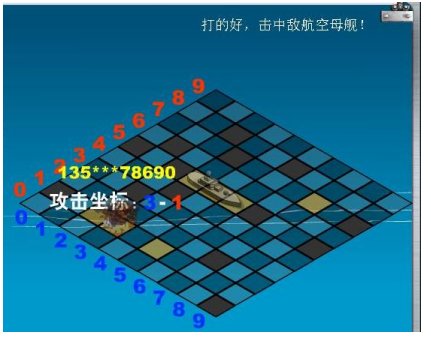 這里是游戲的主戰(zhàn)場,觀眾每發(fā)送一個轟炸坐標(biāo)過來,都會在這里有體現(xiàn)。如轟炸者的手機號、攻擊坐標(biāo)、是否擊中(擊中是一團火光,未擊中則是水花)、及語音及文字提示。