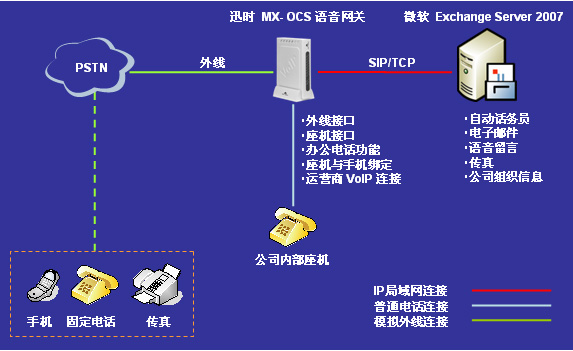 迅時通信針對微軟統(tǒng)一溝通解決方案,在2008年推出了MX-OCS系列辦公型VoIP語音網(wǎng)關。將微軟Exchange Server 2007 統(tǒng)一消息服務器與迅時通信MX-OCS網(wǎng)關集成而構成的解決方案(簡稱“1+1”方案),能大幅降低中小企業(yè)擁有統(tǒng)一溝通平臺的成本。