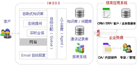 IM800是首家提出并實現(xiàn) “ 網(wǎng)上服務(wù)3.0 ” 思想的新一代綜合網(wǎng)上客戶服務(wù)和支持系統(tǒng),包括各種豐富的“自助服務(wù)” 和 “人工服務(wù)” 產(chǎn)品模塊:
