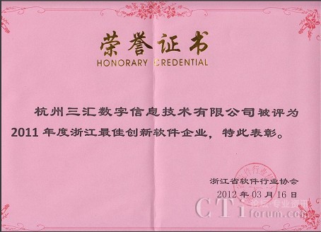 CTI論壇(ctiforum)3月23日消息(記者 浩宇): 2012年3月,浙江省軟件行業(yè)協(xié)會公布了2011年度浙江省軟件行業(yè)評優(yōu)結(jié)果。我們杭州三匯數(shù)字信息技術(shù)有限公司被評為“2011年度浙江最佳創(chuàng)新軟件企業(yè)”,同獲此殊榮的還有阿里巴巴、浙江中控、恒生電子、信雅達、?低、三維通信等其他9家國內(nèi)外知名的軟件企業(yè)。