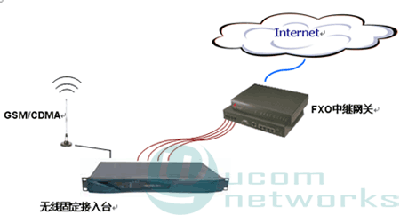 本方案采用FXO中繼語(yǔ)音網(wǎng)關(guān)接入互聯(lián)網(wǎng),由當(dāng)?shù)仄胀M電話線路落地對(duì)接網(wǎng)關(guān)FXO口,采用電話卡綁定網(wǎng)關(guān)預(yù)付費(fèi)計(jì)費(fèi)實(shí)現(xiàn)運(yùn)營(yíng)。落地線路接入可以使用本地固定PSTN線路,也可以轉(zhuǎn)制無(wú)線電話,采用固定臺(tái)接入,2種拓?fù)鋱D如下所示。
