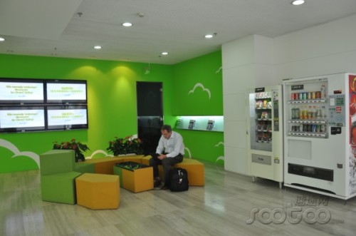 以鮮亮的黃色和綠色為主色調(diào)的天潤(rùn)融通云基地總部休息區(qū)
