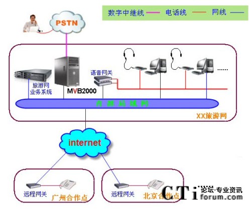 在技術上,旅游網IP呼叫中心解決方案的語音業(yè)務通過電信運營商的模擬電話線路(或者模擬中繼線路)接入,數(shù)據(jù)業(yè)務都通過互聯(lián)網使用TCP/IP協(xié)議傳送,解決了呼叫中心中大量數(shù)據(jù)傳送的需求,請看下面的網絡組織結構圖: