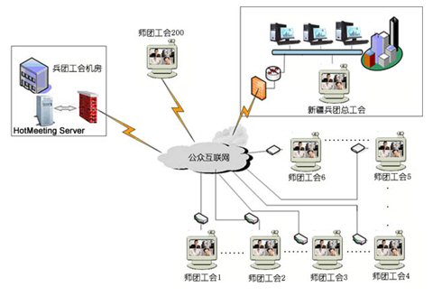 新疆建設兵團工會下設有14個師工會,111個團場工會.共有200個用戶同時參加視頻會議。中心服務器帶寬為100M光纖,各地終端通過網通2M寬帶接入,每個師、團級會場都有自己獨立的機房和會議室,適合進行基于IP網絡視訊會議的應用,在這個網絡平臺上,優(yōu)視(URSACOM)HotMeeting富媒體視頻會議系統(tǒng)所提供的高質量的視頻圖像和方便易用的文檔、文件共享功能,使得兵團工會領導能夠在這個平臺上進行從桌面討論到會議室正式會議等各種規(guī)模應用。通過HotMeeting富媒體視頻會議系統(tǒng),除了進行全團工會系統(tǒng)例會,工作交流等常見的應用之外,遠程培訓等也是經常進行的內容。各個師、團工會系統(tǒng)能利用數(shù)據(jù)功能和兵團總工會協(xié)調業(yè)務,也能把平常培訓的會議材料進行詳細介紹,節(jié)約了以前培訓所花費的大量精力和時間。具體網絡拓撲見下圖: