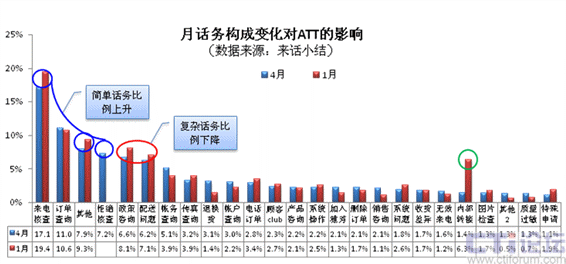 為了分析“話務構(gòu)成”和“業(yè)務周期”影響ATT的關聯(lián)性,我們還是取08年1月和4月的來話小結(jié)分布比例占前5位的數(shù)據(jù),進行參考分析:(下圖11)