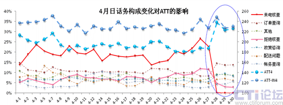 從上圖可見,月頭的上月遺留問題(配送不及時、到貨差異破損、帳務問題等)、月末現(xiàn)場沖刺KPI等客戶流程因素對ATT有明顯影響。需要特別說明的是,4月27日后ATT有一個明顯的揚起,這是客戶業(yè)務政策調(diào)整的直接反應,在下一節(jié)中詳細分析。