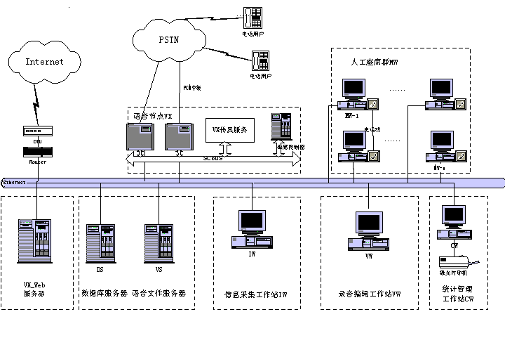 客戶服務(wù)中心系統(tǒng)包含智能排隊機(含接入服務(wù)器)、核心服務(wù)器CCS、交互式語音應(yīng)答系統(tǒng)IVR、語音傳真服務(wù)器、業(yè)務(wù)服務(wù)器、工作流服務(wù)器、數(shù)據(jù)庫服務(wù)器、Internet/Intranet服務(wù)器、人工座席、尋呼機接口,手機短消息接口等組成。如下圖所示為Runsun呼叫中心系統(tǒng)結(jié)構(gòu)圖: