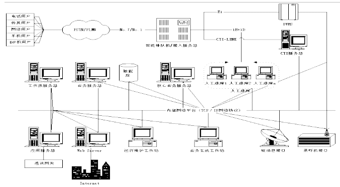 客戶服務(wù)中心充分利用CTI技術(shù)使企業(yè)的業(yè)務(wù)系統(tǒng)最大限度地與用戶建立聯(lián)系,共享用戶的需求等信息資源,從而能夠最大限度的為用戶服務(wù)。簡單地說,客戶服務(wù)中心系統(tǒng)是一個工作組,這個工作組由若干成員組成,這些成員既包括普通的人工座席,也包括一些自動語音設(shè)備、語音信箱等。這些成員通過網(wǎng)絡(luò)實現(xiàn)相互間的通信,并共享網(wǎng)絡(luò)上的資源,并實現(xiàn)與業(yè)務(wù)系統(tǒng)及辦公自動化系統(tǒng)的互聯(lián)。早期的客戶服務(wù)中心系統(tǒng)包括114服務(wù),用戶撥打當?shù)仉娦欧⻊?wù)商的"114",呼叫首先被放到ACD(Automatic