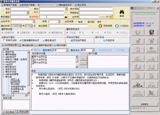 諾和關懷糖尿病服務中心的服務坐席可以實現(xiàn)患者信息的同步提示功能,當電話被分配至坐席的同時,患者的資料信息也同步出現(xiàn)在PC終端上。同時坐席終端可以自動記錄對方的電話號碼,也可以實時顯示正在排隊等待的人數,提示服務人員加快業(yè)務受理速度。