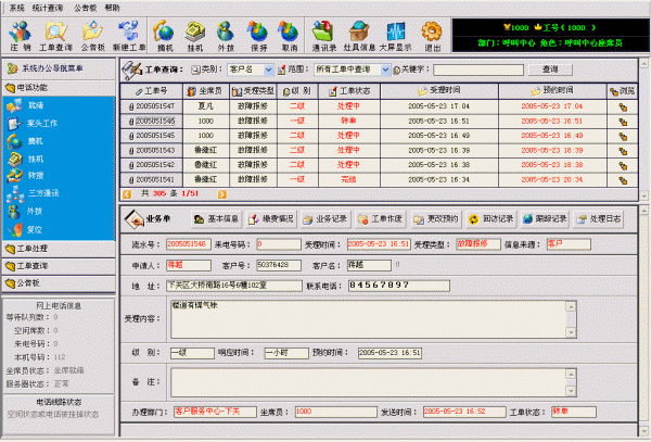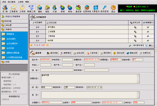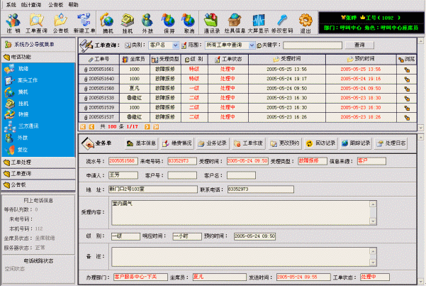 系統(tǒng)聯(lián)通了座席員、營(yíng)業(yè)廳業(yè)務(wù)員、工程管理人員、維修網(wǎng)點(diǎn)派工人員、外勤維修人員、公司管理人員等各種角色使用系統(tǒng)的界面。