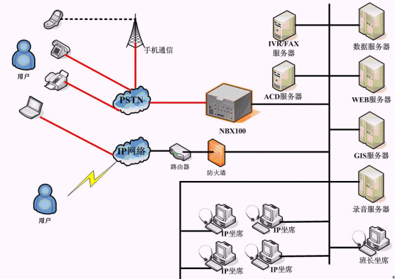 求助中心熱線系統(tǒng)采用華為-3COM 的 NBX100 網(wǎng)絡(luò)交換機(jī)作為呼叫接入設(shè)備,基于純IP交換技術(shù),座席電話全部采用IP話機(jī),部署方式靈活。求助中心系統(tǒng)主要負(fù)責(zé)受理市民投訴,并派發(fā)到相關(guān)二級(jí)網(wǎng)絡(luò)單位;網(wǎng)絡(luò)單位系統(tǒng)主要負(fù)責(zé)處理中心下發(fā)的投訴單據(jù),并進(jìn)行反饋,同時(shí),網(wǎng)絡(luò)單位也可自行受理投訴,并進(jìn)行相應(yīng)的上傳和下發(fā),多級(jí)網(wǎng)絡(luò)單位之間可實(shí)現(xiàn)級(jí)聯(lián)。為了簡(jiǎn)化單據(jù)中轉(zhuǎn)流程,求助中心系統(tǒng)在網(wǎng)絡(luò)派單的基礎(chǔ)上,還結(jié)合自動(dòng)傳真、短信群發(fā)等技術(shù),提供了自動(dòng)傳真派單、自動(dòng)短信派單等多種單據(jù)派發(fā)功能,極大的提高了單據(jù)處理效率。