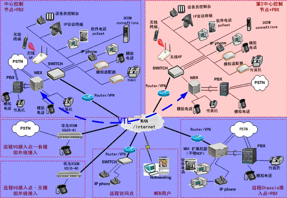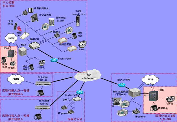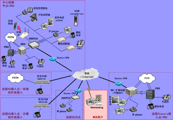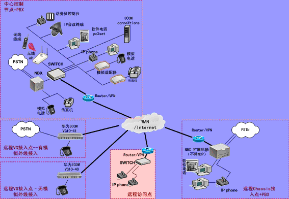 ③.遠程接入的辦公室不再需要專用的 PBX, 只需要將3Com NBX電話終端接入到WAN網(wǎng)中,就能地實現(xiàn)在WAN或Internet上與3Com NBX 網(wǎng)絡(luò)電話系統(tǒng)的互連。