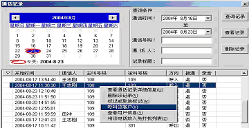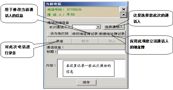 如果有電話打入時,在屏幕的右側(cè)會彈出一個對話框,它顯示了當前來電的號碼和通話人(如果在地址簿中沒有記錄則顯示為未知),點擊彈出全部菜單功能,它相當于一個功能強大的通話記事本,用它既可以邊接聽電話邊整理相關(guān)通話的文字記錄,又可以錄下通話的全部內(nèi)容。如果這個電話是您不愿接聽的,也可以將它設(shè)置為“免打擾”,這樣,這個號碼以后將存入免打擾名單中,若此號碼再呼入,系統(tǒng)將自動掛斷此呼叫。如果這個電話是您認為的重要客戶打過來的,您也可以將此號碼添加到重要客戶組中,以便您今后接聽或設(shè)置電話轉(zhuǎn)移時能與其它呼入電話相區(qū)分。