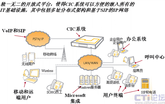 對于企業(yè)而言,CIC是一套基于IP的完整的通信解決方案,與傳統(tǒng)PBX電話系統(tǒng)不同的是,CIC通過一個單一的軟件平臺,可以將語音,數(shù)據(jù)和企業(yè)員工有機的聯(lián)系起來,而傳統(tǒng)的PBX電話系統(tǒng)只能提供語音服務(wù),無法和現(xiàn)今流行的IP信息系統(tǒng)相結(jié)合。