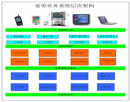 提供多種寬帶業(yè)務(wù)產(chǎn)品包,如網(wǎng)絡(luò)卡拉OK業(yè)務(wù),持網(wǎng)絡(luò)視頻播客業(yè)務(wù),網(wǎng)絡(luò)視寬頻視野業(yè)務(wù),也可根據(jù)用戶需求定制拓展業(yè)務(wù)如遠(yuǎn)程教學(xué)業(yè)務(wù),網(wǎng)絡(luò)音像發(fā)行出版業(yè)務(wù)(數(shù)字版權(quán)保護(hù)),網(wǎng)絡(luò)電視臺業(yè)務(wù),多媒體辦公業(yè)務(wù)等。
