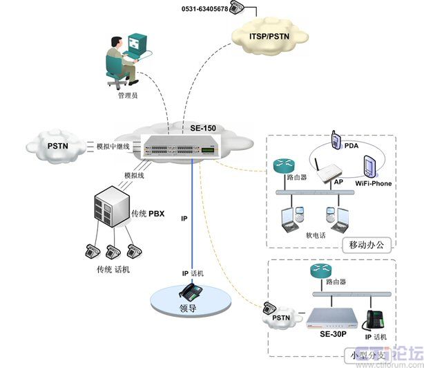 SE150還可以通過配置FXO、E1/T1等擴(kuò)展模塊,實(shí)現(xiàn)與PSTN或傳統(tǒng)PBX設(shè)備的互聯(lián),實(shí)現(xiàn)與傳統(tǒng)語音交換設(shè)備的互通。通過SE150的IP中繼方式,不但可以連接到本公司的其它IP PBX設(shè)備,還可以實(shí)現(xiàn)與運(yùn)營商的NGN平臺(tái)對(duì)接,實(shí)現(xiàn)基于IP網(wǎng)的互聯(lián)。
