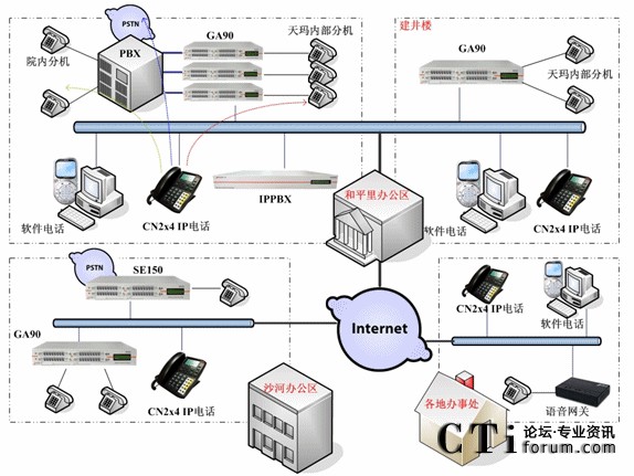 具體情況是:和平里的總部與沙河辦公區(qū)之間為網(wǎng)絡(luò)專線,并有公網(wǎng)出口。各辦事處使用ADSL撥號上網(wǎng)方式?偛康姆桨冈O(shè)計中,使用了5臺GA90網(wǎng)關(guān),兩臺IPPBX以及多部IP話機和軟件電話。和平里辦公區(qū)工位數(shù)量為120左右,其中多數(shù)工位需要部署模擬話機,個別工位屬于非固定的移動工位,需要部署CN2x4