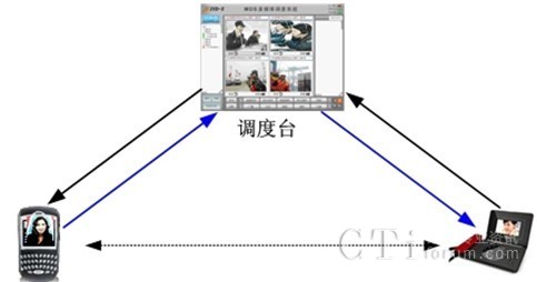 當(dāng)指揮人員需要讓兩個(gè)視頻設(shè)備實(shí)現(xiàn)點(diǎn)對(duì)點(diǎn)視頻通信時(shí),如兩個(gè)終端是同一型號(hào)設(shè)備,可直接進(jìn)行視頻通信,如兩個(gè)不同型號(hào)的視頻設(shè)備需要進(jìn)行視頻通信,可由調(diào)度臺(tái)調(diào)度兩個(gè)視頻設(shè)備,然后通過視頻轉(zhuǎn)發(fā)功能實(shí)現(xiàn)兩個(gè)不同視頻設(shè)備的視頻通信。