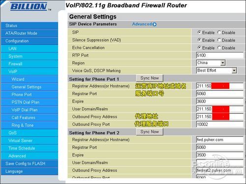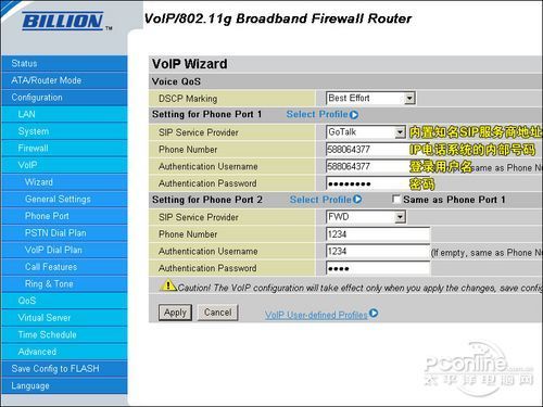 把申請得到的相關(guān)數(shù)據(jù)填入BiPAC 6404VGP中,在路由器后面接上電話就可以享受完全免費(fèi)或超低價格的電話服務(wù)了。同一個SIP服務(wù)器下面的用戶互相撥打電話、收發(fā)傳真是免費(fèi)的。