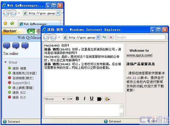 Web即時(shí)通信,對(duì)任意地方的客戶,是用IE即可以訪問(wèn)"對(duì)話"。所以,它虛擬出一個(gè)銷售人員的接觸途徑。