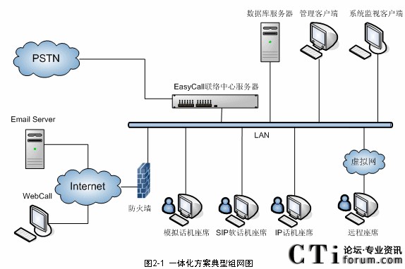圖2-3 EasyCall聯(lián)絡(luò)中心系統(tǒng)結(jié)構(gòu)圖-一體化方案