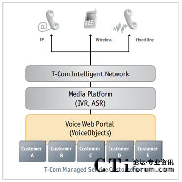 T-Com轉(zhuǎn)向VoiceObjects尋求一個(gè)可以管理成百上千應(yīng)用的解決方案,確保對(duì)客戶的高可用性和可靠性,并且?guī)椭3脂F(xiàn)有和未來(lái)的開(kāi)發(fā)和更改成本在一個(gè)低水平上。在2004年初,T-Com引入了語(yǔ)音Web門(mén)戶,一個(gè)發(fā)揮了Web基礎(chǔ)架構(gòu)和立足于VoiceObjects服務(wù)器網(wǎng)絡(luò)版本的語(yǔ)音應(yīng)用服務(wù)平臺(tái)!拔覀冋趯ふ也粌H能幫助我們開(kāi)發(fā),而且可以維護(hù)和管理我們的自服式電話應(yīng)用的解決方案,”Klindworth說(shuō):“當(dāng)時(shí)真的還沒(méi)有電話應(yīng)用服務(wù)器公司目錄,但這正是我們需要的:該產(chǎn)品是服務(wù)執(zhí)行平臺(tái),并且以Web應(yīng)用服務(wù)器的方式工作。我們發(fā)現(xiàn)它就是VoiceObjects。”