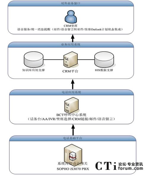 原先電話系統(tǒng)與CRM系統(tǒng)是獨立的兩個系統(tǒng),客服人員面對大量的客戶,迅速的獲悉來電客戶的身份、背景資料以及歷史資料在很大程度上決定了其服務(wù)質(zhì)量。BCT呼叫中心系統(tǒng)位于PBX與CRM之間,作為一個中間的橋梁,對PBX送來的電話信息或者用戶輸入的卡號等數(shù)據(jù)進行處理分析,對主叫號碼或用戶輸入卡號進行識別后,傳遞給CRM;CRM檢索與其相連的HIS(醫(yī)院信息系統(tǒng))的數(shù)據(jù)庫,將客戶資料以及相關(guān)的歷史記錄通過彈出網(wǎng)頁的模式,同步的顯示在坐席的計算機上,方便客服代表的輸入和后續(xù)操作,提高了效率與正確率。同時,客戶代表還可以在CRM頁面中點擊電話號碼,通過BCT發(fā)起電話呼叫來聯(lián)系客戶,來處理用戶回訪等工作。