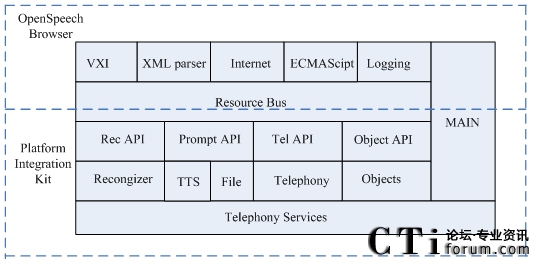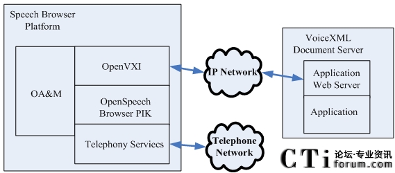 OpenSpeech Browser PIK自身就是支持標(biāo)準(zhǔn)的VoiceXML 2.0的標(biāo)準(zhǔn),同時(shí)對(duì)VoiceXML的解析能力比較強(qiáng)大,又同時(shí)整合了Apache的XML解析器、W3C的LIBWWW進(jìn)行Web訪問(wèn)和Mozilla Spider Monkey作為ECMA Script的執(zhí)行器,本文主要是通過(guò)實(shí)現(xiàn)相應(yīng)的語(yǔ)音平臺(tái)接口來(lái)實(shí)現(xiàn)IVR系統(tǒng)的執(zhí)行引擎。沒(méi)有對(duì)VoiceXML解析功能做過(guò)多的修改。
