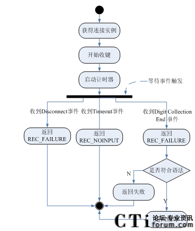 4)如果接收到SC_EVENT_DISCCONET事件,表示用戶主動(dòng)放棄,返回REC_FAILURE,調(diào)用EndSession,流程結(jié)束;如果接收到SC_EVENT_TIMEOUT事件,表示用戶在計(jì)時(shí)器的時(shí)間內(nèi)沒(méi)有輸入,返回REC_NOINPUT,調(diào)用EndSession,流程結(jié)束;如果接收到SC_EVENT_DTMF_RECEIVED事件,表示用戶輸入完畢,進(jìn)入下一步;