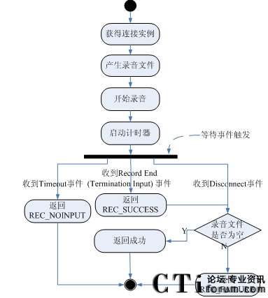 7)檢查錄音文件是否有數(shù)據(jù)。如果錄音文件沒(méi)有數(shù)據(jù)不存在數(shù)據(jù),表示錄音不成功,返回REC_FAILURE,調(diào)用EndSession,流程結(jié)束;如果錄音文件有數(shù)據(jù),表示錄音成功,返回成功,調(diào)用EndSession,流程結(jié)束。