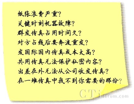 對于大多數(shù)企業(yè)而言,傳真有其不可替代的地位:銷售、采購、訂單、合同,這些企業(yè)的生命線都離不開傳真。使用傳統(tǒng)的傳真機,您遇到過下列情況嗎?