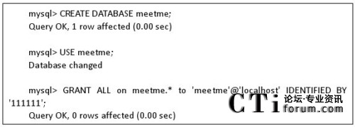 5)我們依次創(chuàng)建數(shù)據(jù)庫meetme,創(chuàng)建用戶meetme,并設(shè)置meetme的密碼,詳細(xì)命令以及正確輸出如下: