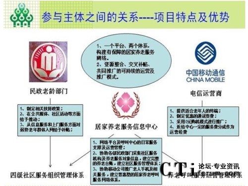 項(xiàng)目運(yùn)作思路,以專(zhuān)業(yè)的運(yùn)營(yíng)機(jī)構(gòu)(民辦非企業(yè))作為項(xiàng)目支撐點(diǎn),將政府推動(dòng)居家養(yǎng)老服務(wù)體系建設(shè)的需求和電信運(yùn)營(yíng)商要擴(kuò)大和穩(wěn)定用戶(hù)群的需求向結(jié)合,共同建設(shè)和推動(dòng)居家養(yǎng)老呼叫服務(wù)網(wǎng)絡(luò)體系的建設(shè)。