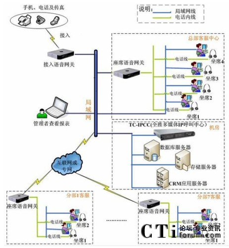 全勝通訊TC-IPCC實(shí)現(xiàn)電話營(yíng)銷外呼和服務(wù)一體化呼叫中心的組網(wǎng)圖: