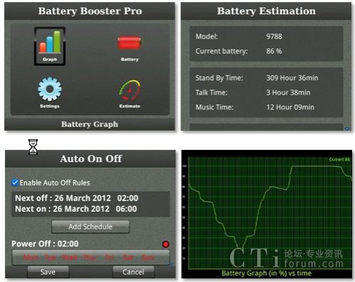 安裝了這么多應(yīng)用,很多同學會考慮我的電池還能hold的住嗎?此次,特別為大家介紹一款名為Battery Booster Pro的手機電量管理應(yīng)用,它可以通過自身具備的五大功能很好的幫用戶管理黑莓手機電量:1. 規(guī)則制定:用戶可以通過它為黑莓手機中的應(yīng)用設(shè)定監(jiān)測規(guī)則,一旦用戶忘記關(guān)閉某應(yīng)用,Battery Booster Pro就會跳出警告標志; 2. 自動開/關(guān)手機:用戶可以為自己的手機設(shè)定自動開關(guān)時間,以節(jié)省不必要得電量消耗;3. 電量提醒,當電量低于一定的百分比后,該應(yīng)用就會自動提示用戶;4. 電量追蹤,Battery Booster Pro還可以通過直觀的圖表顯示出設(shè)備一天內(nèi)的電量消耗狀況;5. 電量預(yù)測,該應(yīng)用還可以預(yù)測出手機所剩的電量在待機、聽音樂和電話等情況下的工作時長。