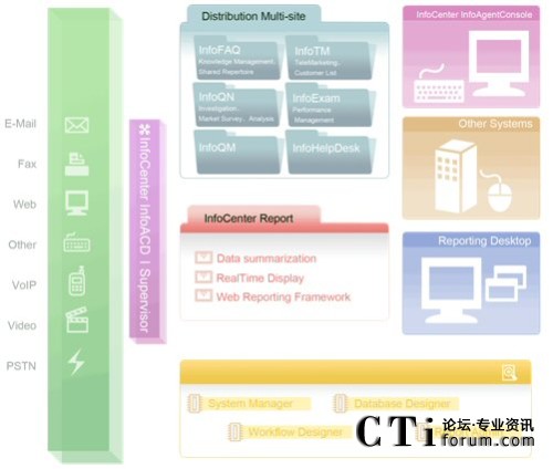 由于今日的客服中心已是多媒體的客服中心,不再只有單純的電話進(jìn)線,客戶尋求服務(wù)的管道更多樣化,InfoCenter Total Solution可以完全整合應(yīng)用程序、數(shù)據(jù)倉(cāng)儲(chǔ)系統(tǒng)、多媒體溝通互動(dòng)管道,藉由不同的系統(tǒng)達(dá)到分析與處理客戶需求,并且達(dá)到一致性的工作流程管理,提供更高質(zhì)量的服務(wù)。