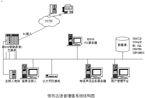 恒訊達語音增值系統(tǒng)是按照先進、可靠、可擴展性、長遠發(fā)展的要求進行設(shè)計,充分體現(xiàn)模塊化系統(tǒng)集成的設(shè)計思想。既滿足數(shù)據(jù)和語音的功能要求,又滿足業(yè)務(wù)需求的功能要求,同時考慮系統(tǒng)增值服務(wù)平臺的發(fā)展空間,以建設(shè)一個高度信息化、自動化的語音增值系統(tǒng)為最終目標。整個系統(tǒng)由可編程交換機(HXD09)、CTI服務(wù)器、交互式語音應答(IVR)服務(wù)器、交互式傳真應答(IFR)服務(wù)器、系統(tǒng)后臺管理、人工座席、業(yè)務(wù)網(wǎng)關(guān)(應用服務(wù)器)、數(shù)據(jù)庫服務(wù)器等部分組成。