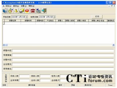 指揮中心信息查詢系統(tǒng)基于客戶/服務(wù)器方式。支持全中文檢索及模糊查詢、組合條件查詢、記錄瀏覽查詢、綜合查詢、提供指揮中心與信息中心間數(shù)據(jù)的雙向數(shù)據(jù)流動(dòng)等功能。還可對(duì)120相關(guān)信息進(jìn)行錄入、分類、保存、歸檔、管理維護(hù),并提供檢索及查詢、綜合匯總、報(bào)表生成、統(tǒng)計(jì)打印及發(fā)送給領(lǐng)導(dǎo)審閱等功能,并可跟蹤值機(jī)人員對(duì)120報(bào)警的受理急救、指揮的每一步驟的處理情況。
