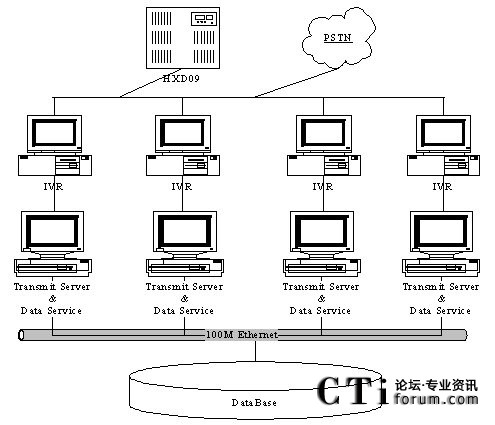 語(yǔ)音接入處理部分主要完成用戶的語(yǔ)音話路接入功能。其中:HXD09語(yǔ)音交換機(jī)可以支持七號(hào)信令和一號(hào)信令的數(shù)字E1線路的接入。HXD09的IVR完成自動(dòng)業(yè)務(wù)受理功能,實(shí)現(xiàn)系統(tǒng)7*24小時(shí)不間斷服務(wù)。CTI完成對(duì)排隊(duì)機(jī)的監(jiān)視、控制任務(wù),并能夠?qū)崟r(shí)的提供每個(gè)語(yǔ)音通道的信息配合IVR完成自動(dòng)繳費(fèi)業(yè)務(wù)的實(shí)現(xiàn)。
