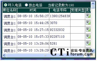 當(dāng)電話打進(jìn)來,話務(wù)員提話機(jī)時(shí)系統(tǒng)便自動(dòng)進(jìn)行錄音,系統(tǒng)把語音信號以數(shù)字化語音格式寫入硬盤。同時(shí)系統(tǒng)記錄其通話日期、摘機(jī)時(shí)間、掛機(jī)時(shí)間和當(dāng)前通話時(shí)間等信息,如果該次電話為打出電話,還可記錄其打出的電話號碼。當(dāng)值班人員掛機(jī)時(shí)系統(tǒng)便會自動(dòng)停止錄音。