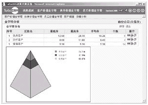 TurboCRM系統(tǒng)中的客戶(hù)價(jià)值金字塔,支持對(duì)分析結(jié)果中呈現(xiàn)的某個(gè)價(jià)值區(qū)間的客戶(hù)群進(jìn)行共性特征的抽象和提煉,幫助企業(yè)決策人發(fā)現(xiàn)重要客戶(hù)之間的共性,從而有助于尋找和挖掘最有價(jià)值的客戶(hù)(如表4、表5所示)。這一功能可以將零散的數(shù)據(jù)轉(zhuǎn)化為知識(shí),迅速地為企業(yè)決策人提供有效幫助。