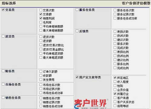 TurboCRM在長期支持CRM應(yīng)用實(shí)踐過程中,總結(jié)出一套完整實(shí)用的客戶價值評估模型,評估指標(biāo)包括交易類、財(cái)務(wù)類、服務(wù)類、反饋類、枚舉類、自定義指標(biāo)等(如圖),結(jié)合不同的指標(biāo)可以幫助企業(yè)評估客戶價值。