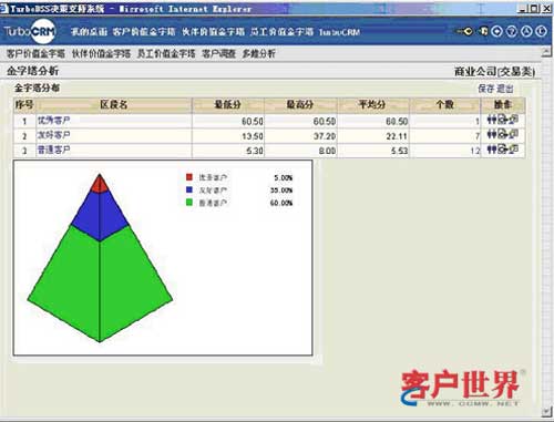 根據(jù)預(yù)先設(shè)定的客戶價值評估模型,CRM會自動計(jì)算出每個客戶的價值得分以及對應(yīng)到不同等級的客戶價值,并會記錄到客戶項(xiàng)下,便于業(yè)務(wù)人員在與客戶接觸時,直觀了解客戶價值情況。客戶價值金字塔分析(如圖),可以動態(tài)的了解各類客戶的價值分布。