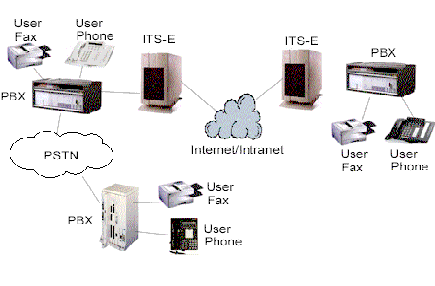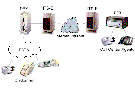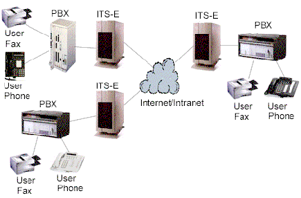 許多公司有多個辦公地點,各地之間有著頻繁的通訊往來,電話和傳真。典型地,通訊涉及到公用交換電話網(wǎng)(PSTN)或PBX間的私人連接路線。Internet電話服務(wù)器(ITS-E)提供了另一選擇。基本原理是一處用戶撥打的電話經(jīng)本地PBX路由到本地ITS-E,本地ITS-E通過IP網(wǎng)絡(luò)送到目的地ITS-E,目的地ITS-E再將電話送到目的地PBX上,最后送到目的地電話或傳真機上。